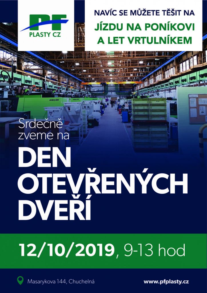 Na den otevřených dveří zve všechny zájemce v sobotu 12. října od 9 do 13 hodin společnost PF Plasty z Chuchelné. Výrobce plastových dílů pro automotive i další průmyslová odvětví tak chce oslovit především rodiny s dětmi, u nichž by prohlídka výrobních provozů mohla povzbudit zájem o techniku a technické obory.