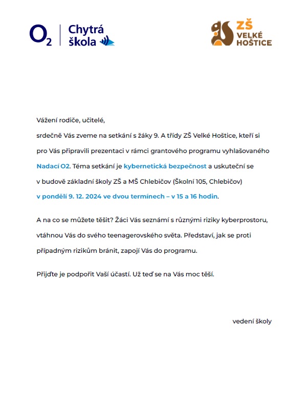 Setkání se žáky 9. třídy ZŠ Velké Hoštice. v pondělí 9. 12. 2024 v 15 a v 16 hod.