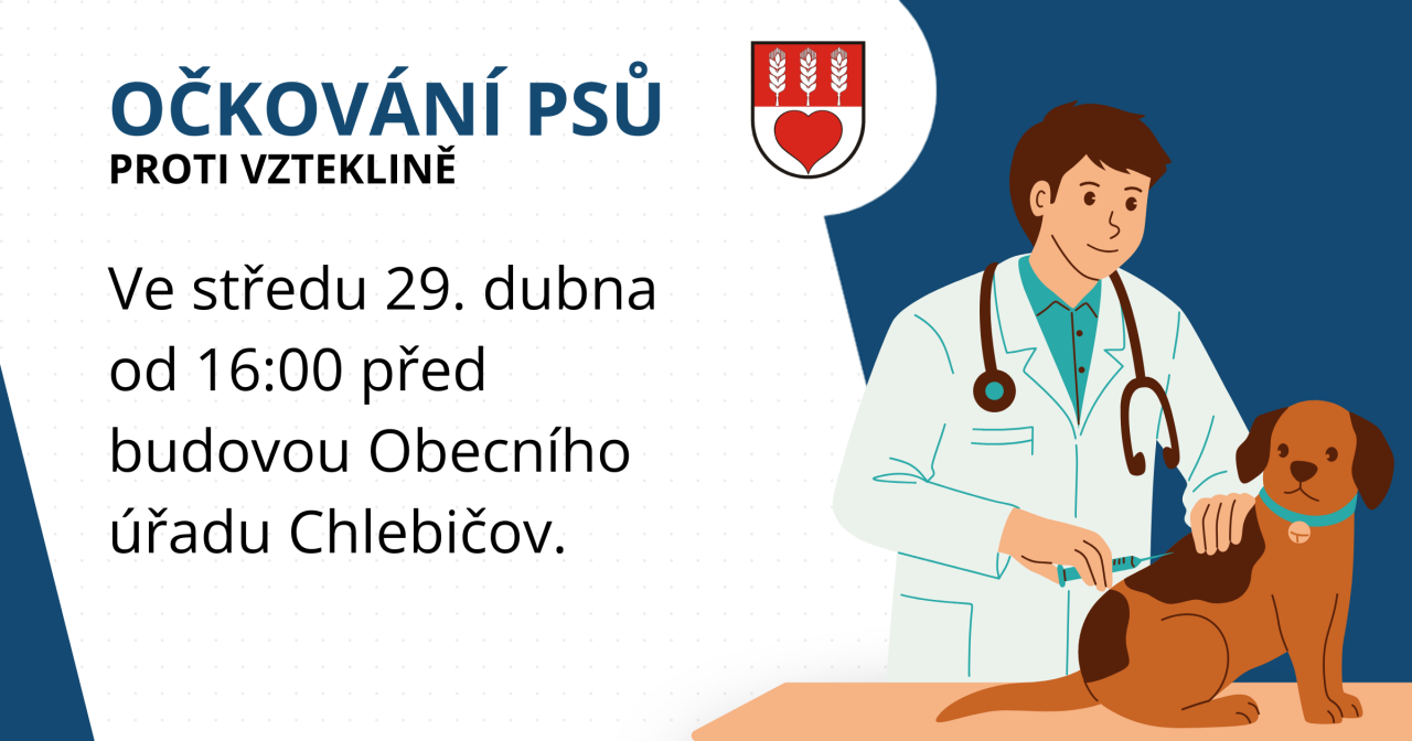 Ve středu 29. dubna bude od 16:00 do 16:45 hod. MVDr. Ostárek před budovou obecního úřadu očkovat psy a kočky proti vzteklině. Cena je 200 Kč.
