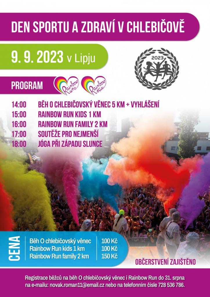 V sobotu 9. září vypukne tradiční běh O chlebičovský věnec společně s netradičním během Rainbow Run pro děti a také pro rodiny. Dále budou připraveny soutěže pro děti a jóga při západu slunce. Neváhejte a přihlaste se! Více informací v přiloženém plakátu.